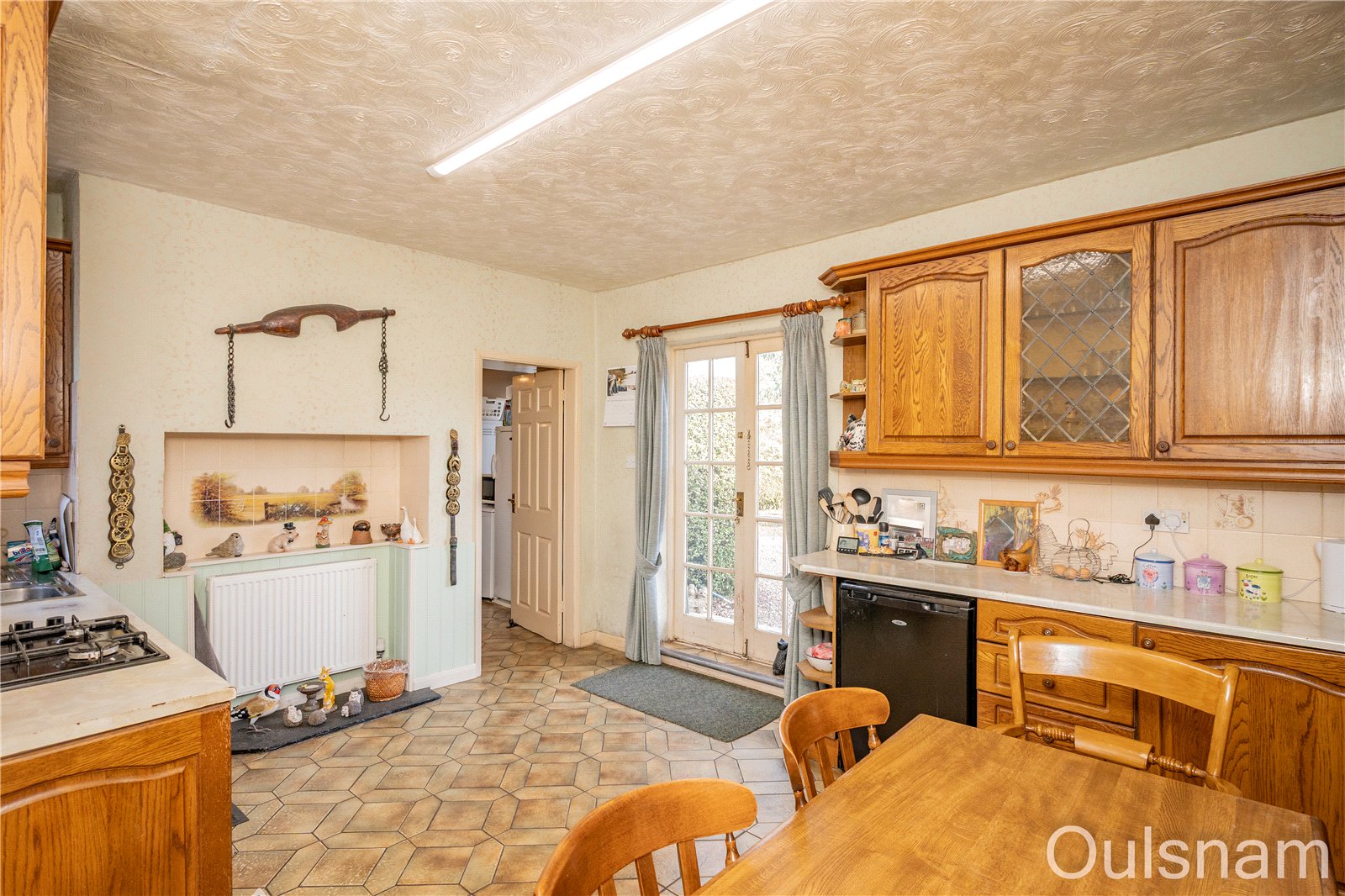 Kitchen/diner with a range of wall and base units, work surfaces over, inset one-and-a-half bowl sink and drainer, gas hob with extractor fan above, built-in electric double oven, space for fridge, plumbing and space for dishwasher, radiator, door leading to stairs down to the cellar, double doors out to the side looking out to ornamental patio area and window to the opposite side. A door from the kitchen leads to the: