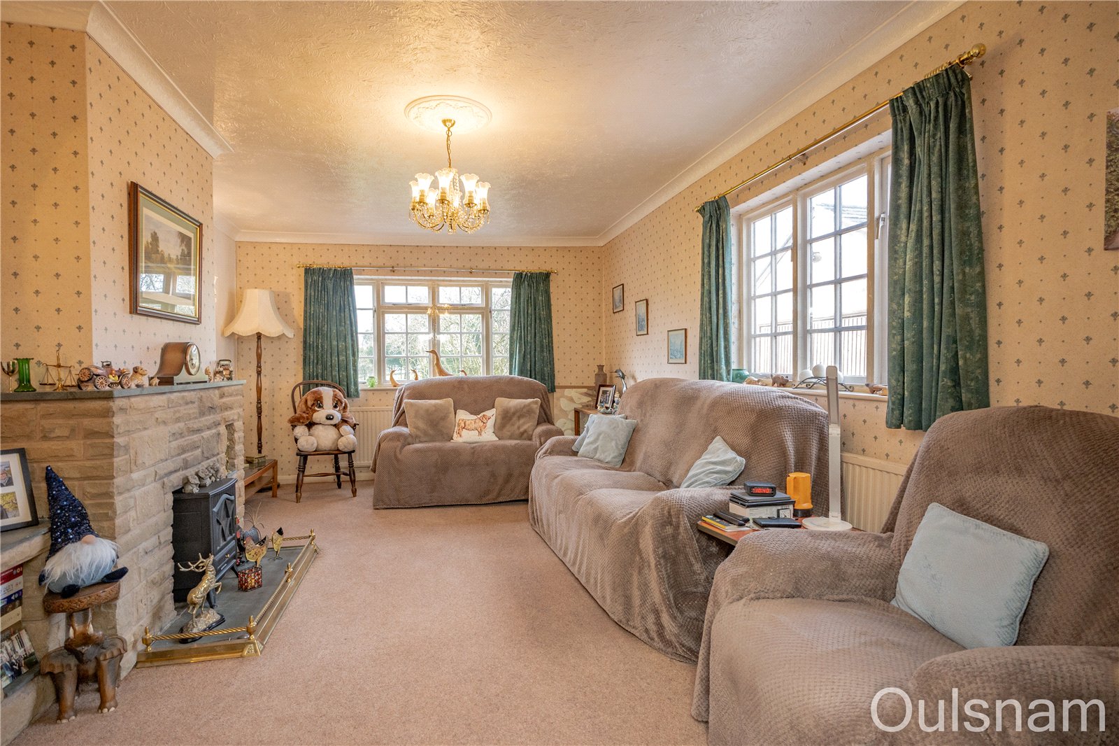 Lounge with windows to the rear and side, two radiators and brick-built fireplace.