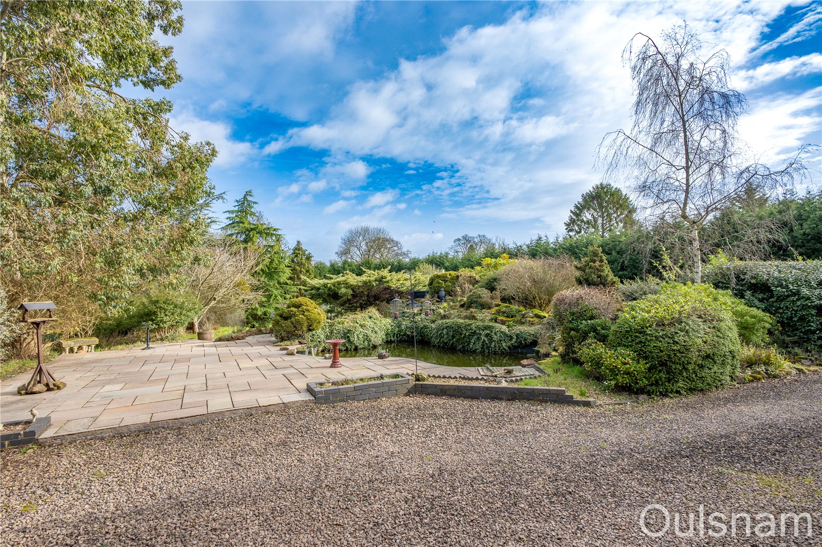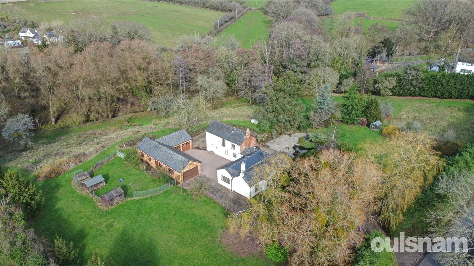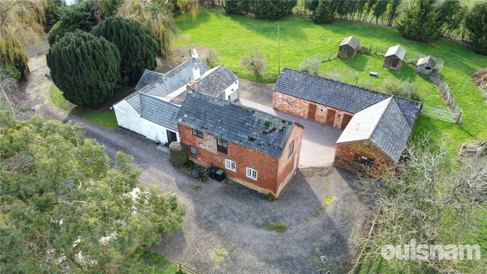 Outside, the property enjoys a beautiful block-paved courtyard surrounded by an extensive range of outbuildings, including multiple garages and useful storage sheds. A sweeping driveway wraps around the home, providing ample offroad parking for numerous vehicles. Beyond, the grounds extend to four acres (TBC) of mature gardens, featuring a variety of established trees, shrubs, and a large picturesque patio area with fish pond.