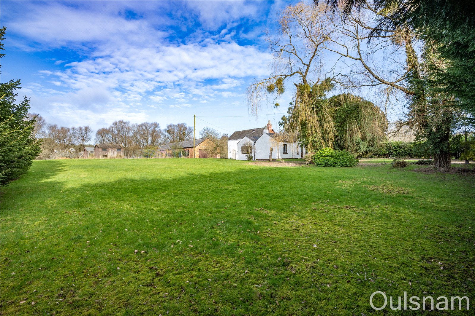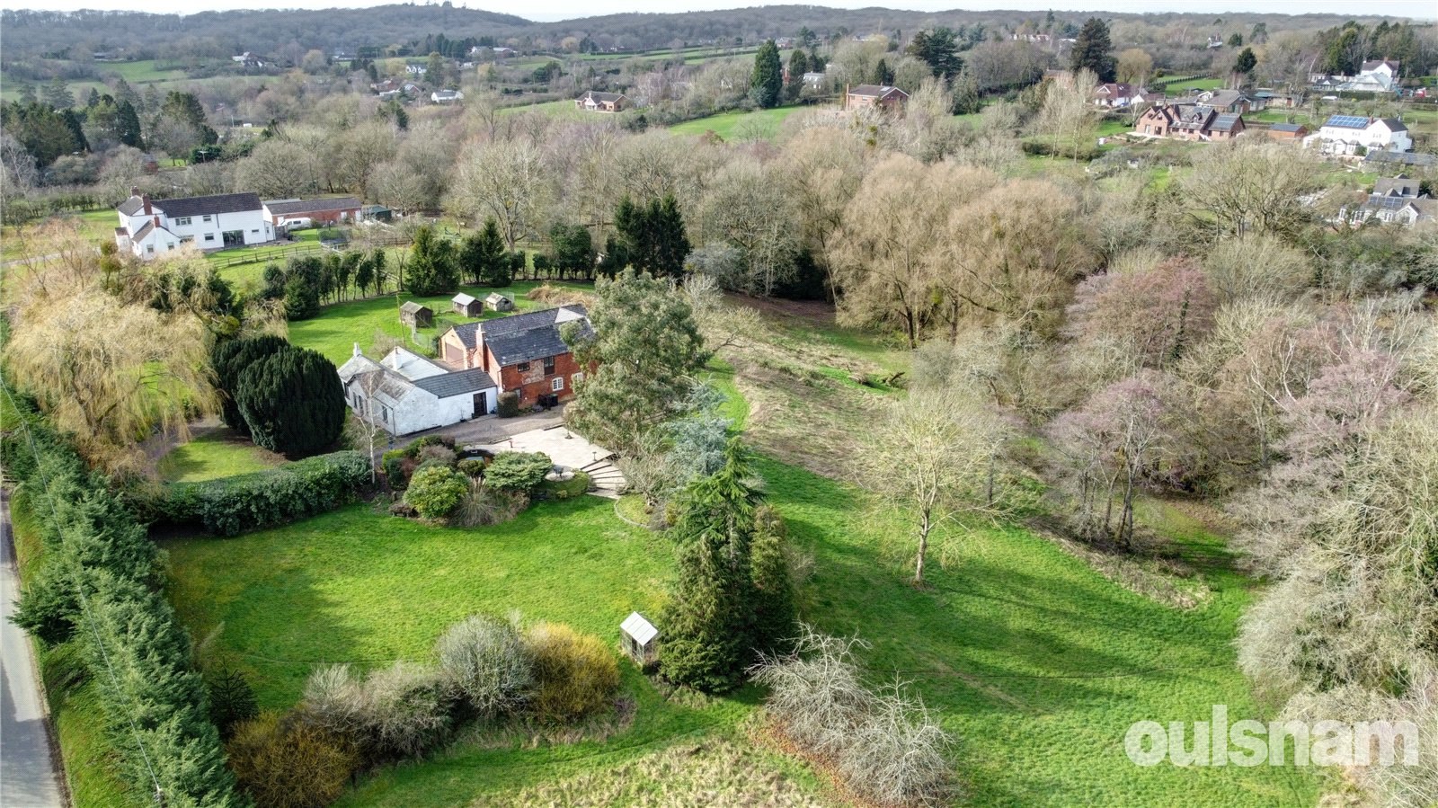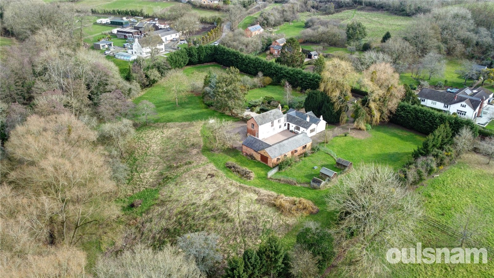 Outside, the property enjoys a beautiful block-paved courtyard surrounded by an extensive range of outbuildings, including multiple garages and useful storage sheds. A sweeping driveway wraps around the home, providing ample offroad parking for numerous vehicles. Beyond, the grounds extend to four acres (TBC) of mature gardens, featuring a variety of established trees, shrubs, and a large picturesque patio area with fish pond.