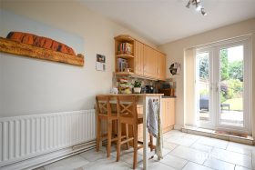 * Modern style kitchen with breakfast area for table and chairs. Integral oven, hob, extractor fan and fridge with double doors opening to the rear garden