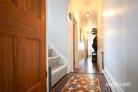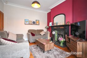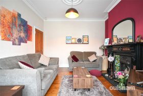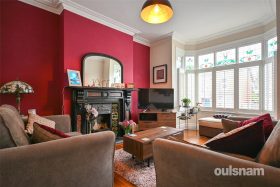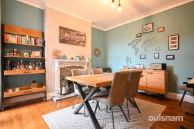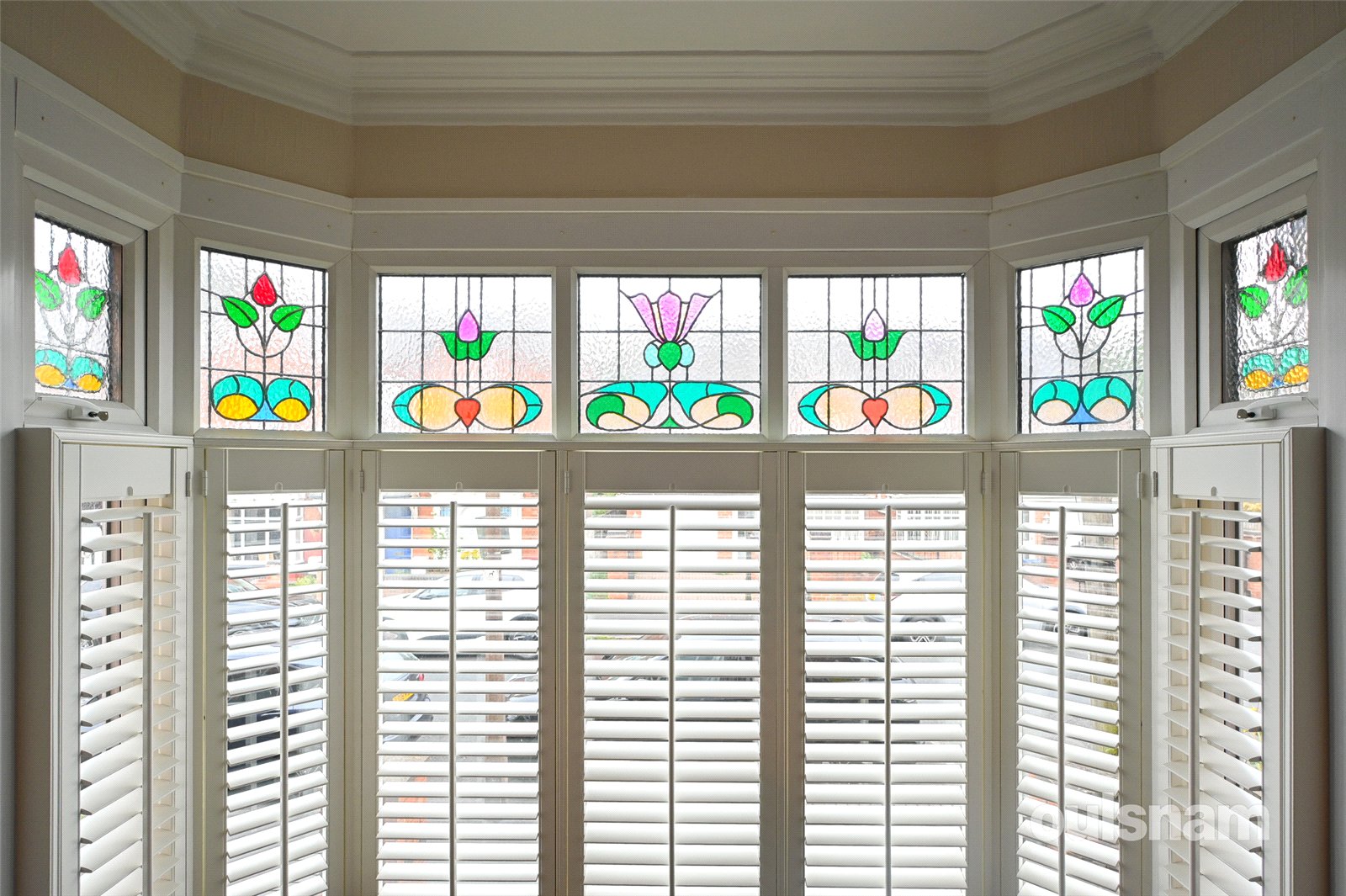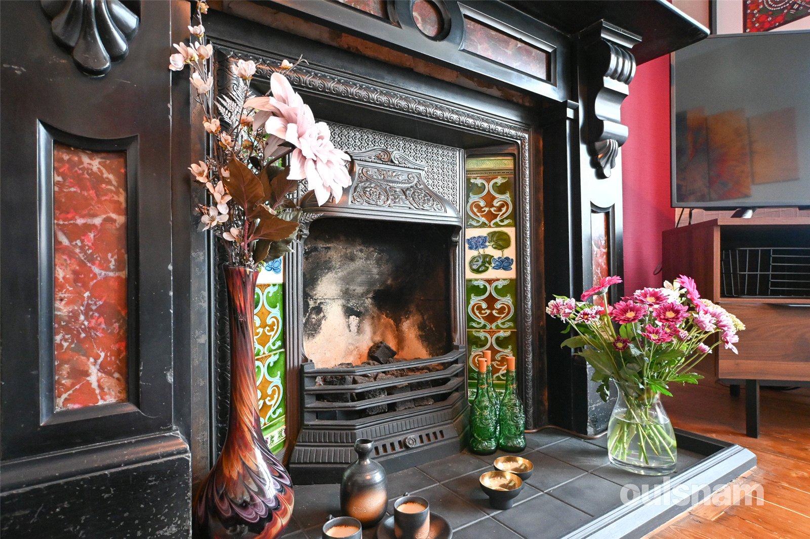 * Two separate reception rooms; first being bay fronted with shutter blinds, stained glass windows, coving, ceiling rose, exposed floorboards and a stunning feature fireplace