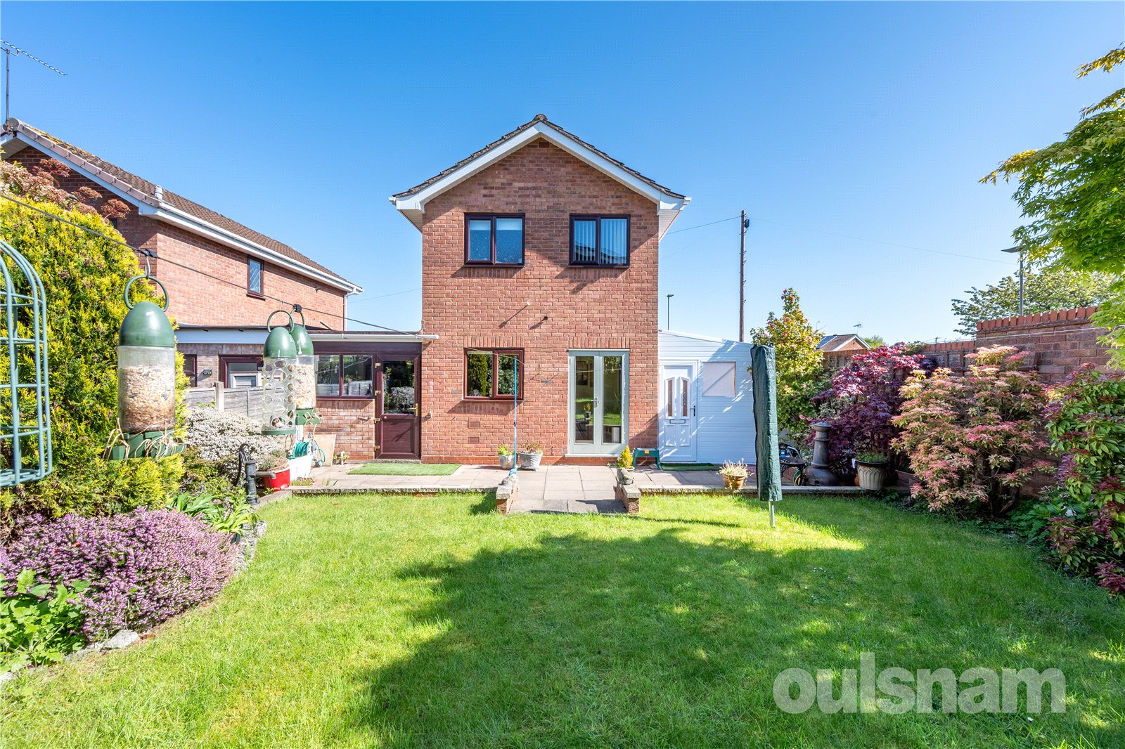 * South-facing, mainly lawned rear garden with variety of mature plants, shed and patio area, and outbuilding constructed to side offering additional storage space.