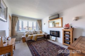 -Lounge with electric fireplace and bow window overlooking frontage