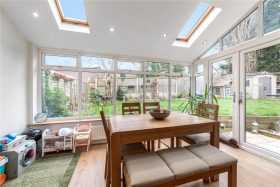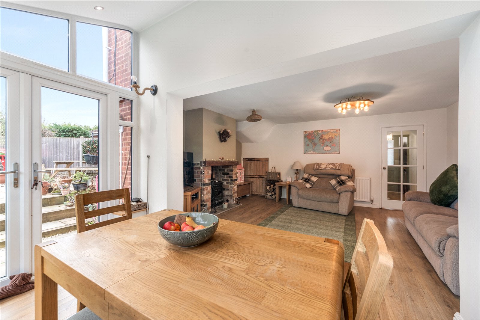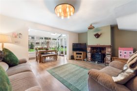 The spacious lounge features a charming log burner, creating a warm and inviting atmosphere, seamlessly flowing into a versatile dining room or playroom, ideal for entertaining. Double doors open onto the private gardens, enhancing the indoor-outdoor living experience.