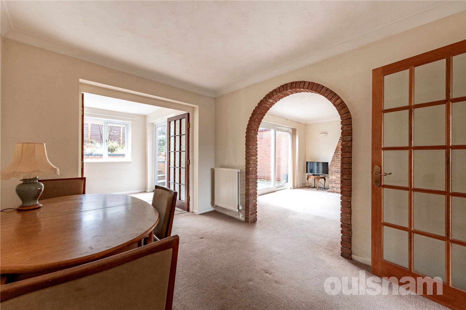 The dining room sits at the centre of the home, featuring an archway into the lounge, which offers an feature electric fire and patio doors out to the rear garden.