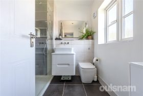 * The en-suite was re-fitted, having tiles from floor to ceiling, spotlights and comprises double width walk-in shower with rainfall shower, floating vanity unit with wash hand basin inset and dual flush W.C. There is a heated towel rail and an obscure window to the rear;