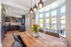 * The dining kitchen was re-fitted in 2022, having spotlights to the ceiling, luxury vinyl tile flooring, a vertical radiator and a range of wall and base units with sink inset. Integrated appliances to include fridge/freezer, dishwasher, eye level double oven, induction hob with extractor above and built-in bin. There are two double glazed windows to the rear, boasting a bay window and a door leads out to the rear garden. There is a door into;