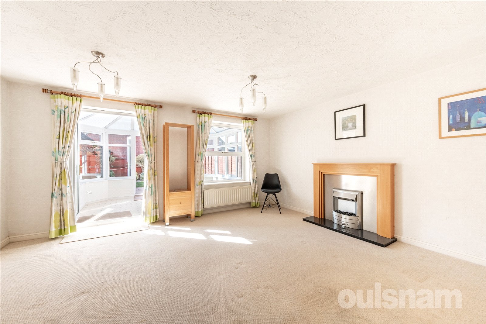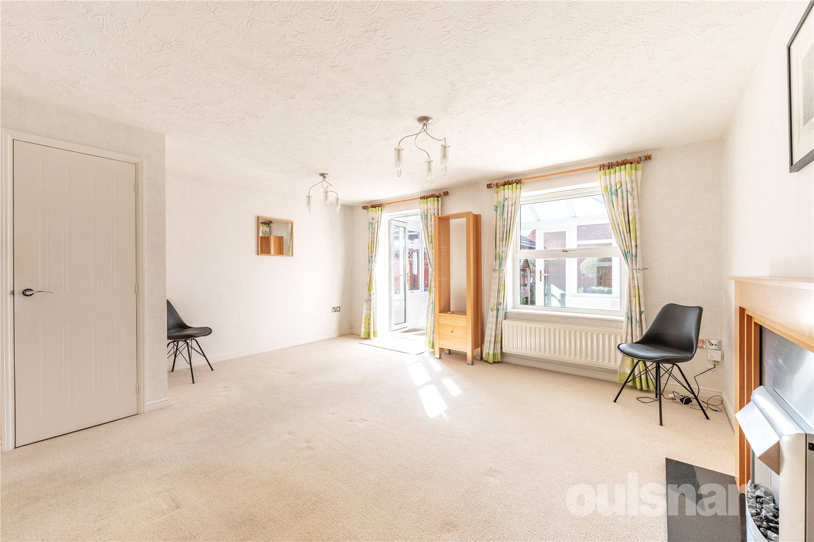* The dining lounge boasting feature electric fireplace with surround, useful understairs storage cupboard and a double glazed window and French doors into the conservatory;
