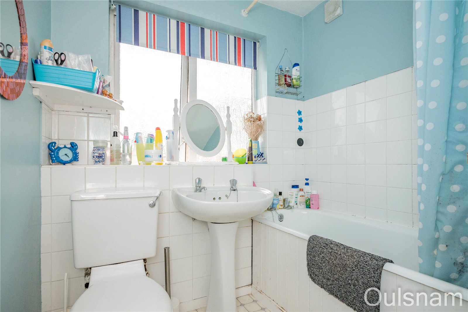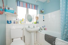 Bathroom which has a bath with a shower over, a wash hand basin, a low level toilet and a window looking out to the rear.