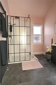 The modern shower room has a spacious walk-in shower with glass shower screen and wash hand basin with cosmetic cabinet below. There is a separate w,c, with high level cistern and stained glass window.