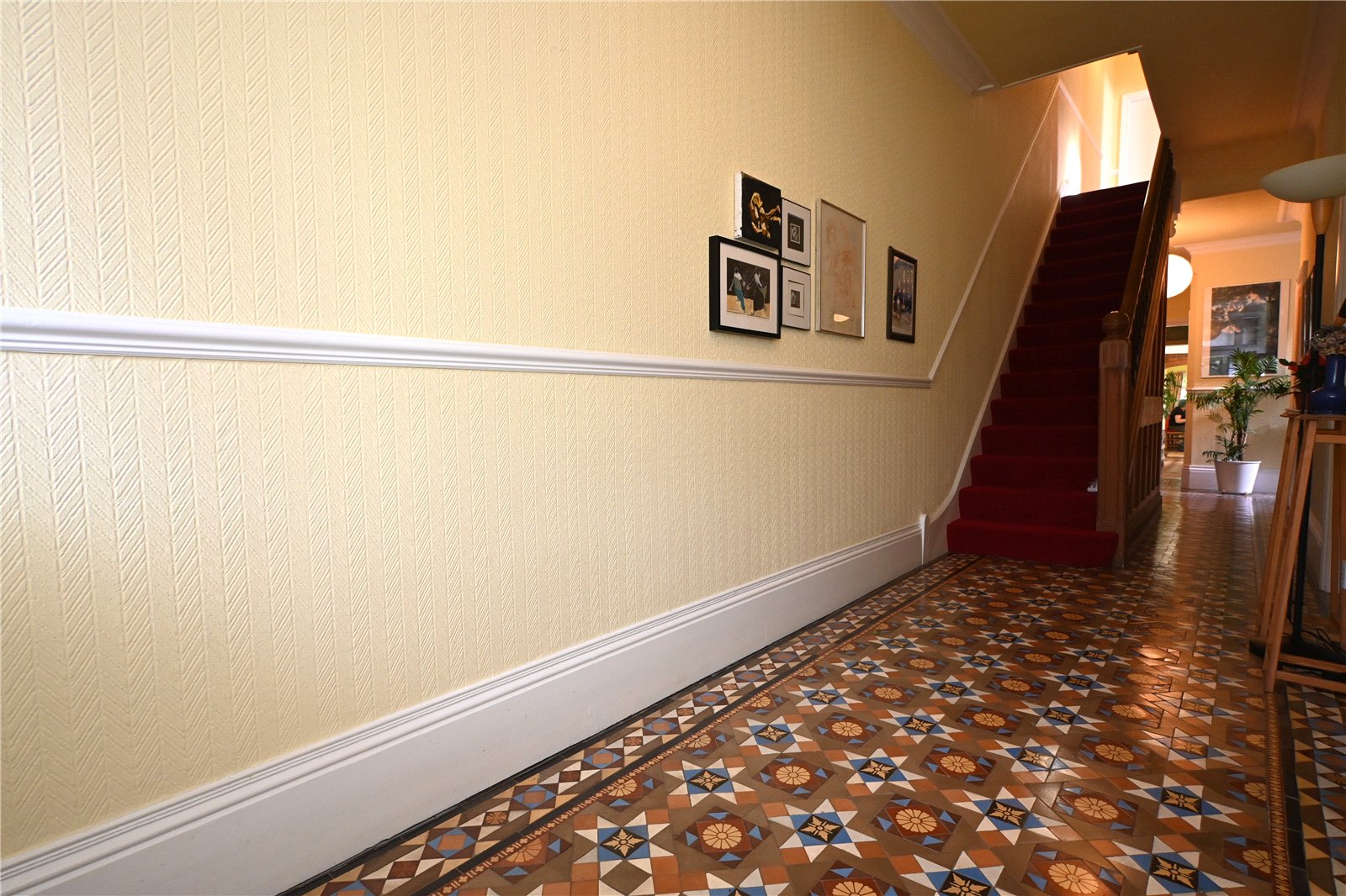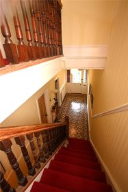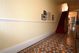The impressive reception hall has a beautifully maintained full length Minton tiled floor. Stairs lead to the first floor with spindle balustrade and a panelled door leads to the cellar. There is ceiling cornicing & dado rails and a door gives access to the side courtyard garden. Stripped panelled doors lead to all three reception rooms and the guest cloakroom with white suite.