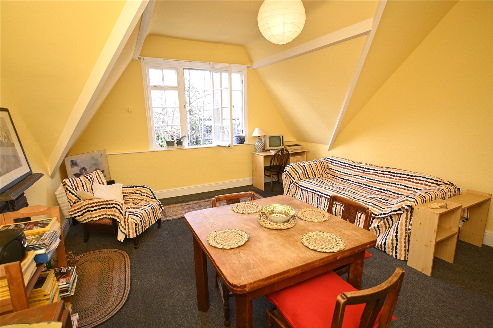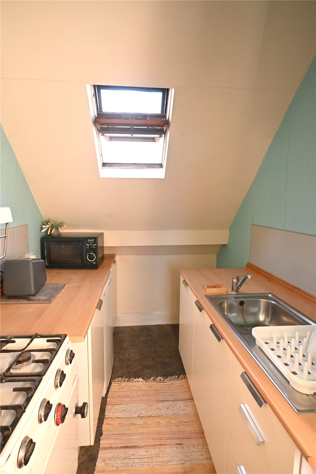 The second floor leads to two further double bedrooms with sloping ceiling lines and there is a kitchenette with a range of fitted base units with inset sink unit and space for cooker.