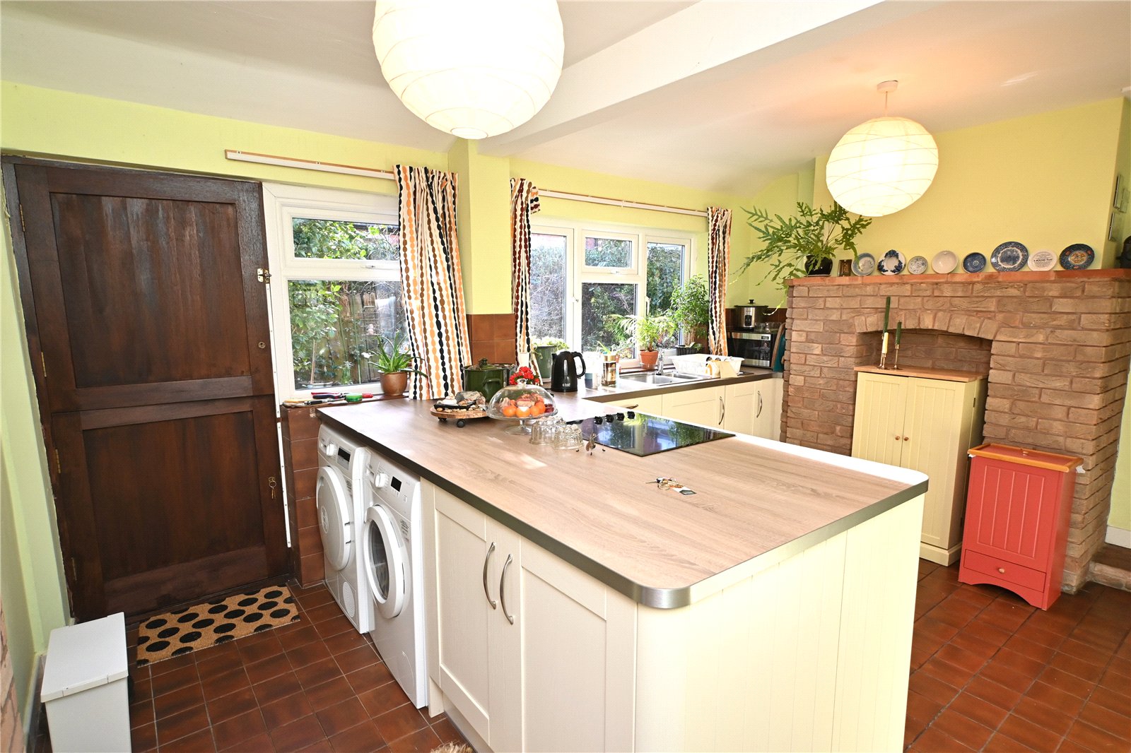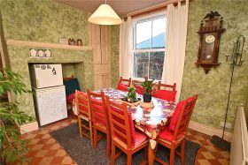 The dining room has a quarry tiled floor, original panelled crockery store with panelled doors and access to the attractive breakfast kitchen fitted with a range of panelled base and drawer units with inset sink unit and ceramic electric hob with stainless steel oven below, integrated fridge, spaces for washing machine and tumble dryer, feature brick chimney breast, quarry tiled floor, stable door to the garden and open access with central exposed brick pillar to the breakfast area with window overlooking the garden.
