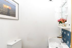 * The first-floor bathroom is fitted with a W.C., a vanity wash hand basin, and a bath with an overhead shower, combining functionality and style in a bright, well-appointed space.