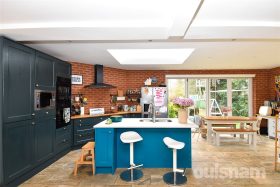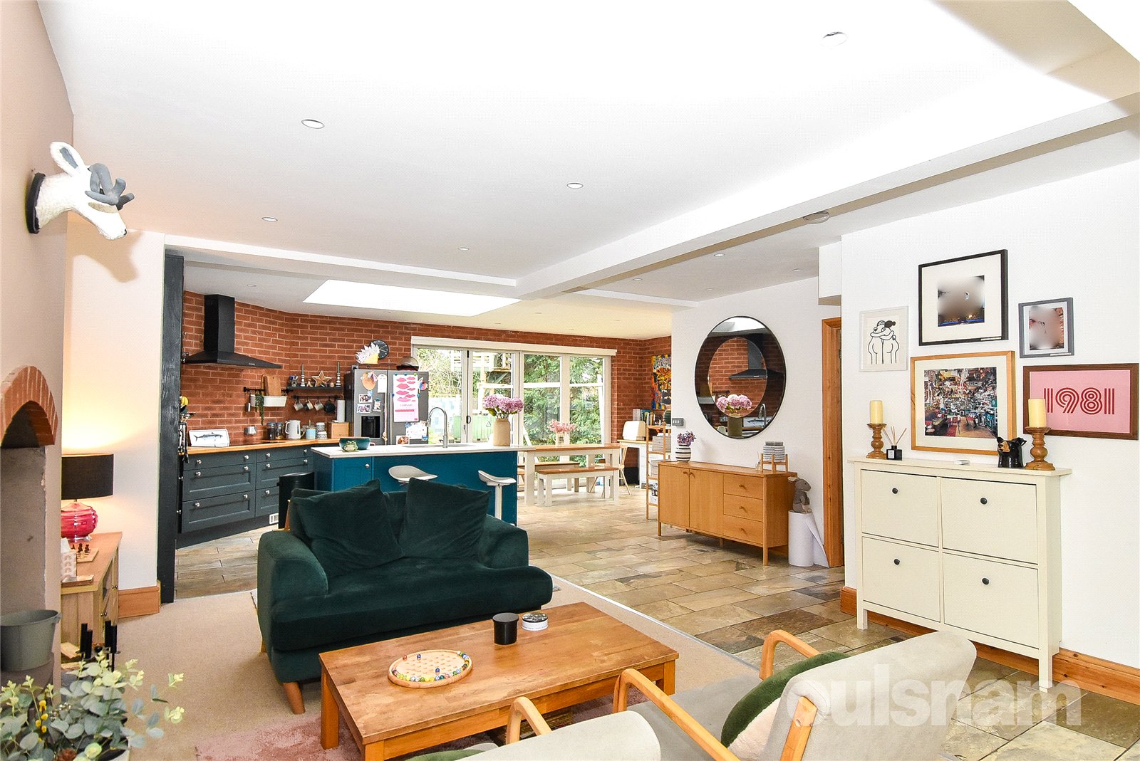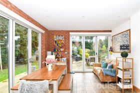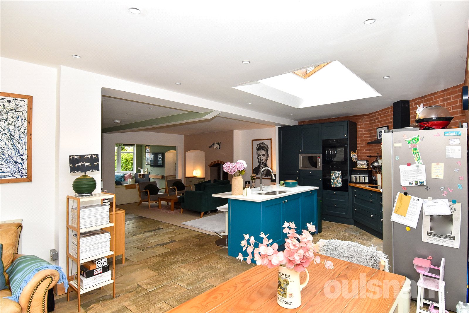 * Continuing on from the sitting area and open reception room, you enter an impressive kitchen/dining space, thoughtfully designed for modern living. This stunning area is enhanced by a skylight and two sets of bi-fold doors, allowing natural light to pour in and creating a seamless connection to the outdoors. The kitchen itself features a central island with seating, complemented by a range of base cupboards and wall-mounted units providing ample storage. Integrated appliances include a hob with extractor fan, two ovens, microwave, and dishwasher, with additional space to accommodate a fridge freezer. The layout is both practical and beautifully arranged, making it ideal for everyday family life and entertaining. To the right, adjacent to the bi-fold doors, there is ample space for a dining table and additional seating, creating a perfect setting for gatherings and social occasions.