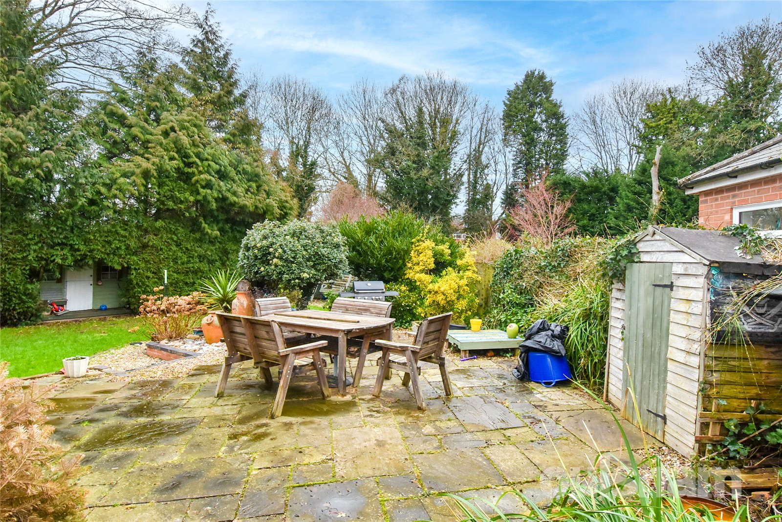 * The property benefits from a generous garden, ideal for outdoor enthusiasts or families. A paved patio wraps around the property, providing a versatile space for seating and entertaining. Beyond the patio lies a well-maintained grassed lawn, with a pebbled pathway leading to a dedicated area for garden sheds, combining practicality with plenty of outdoor space to enjoy.