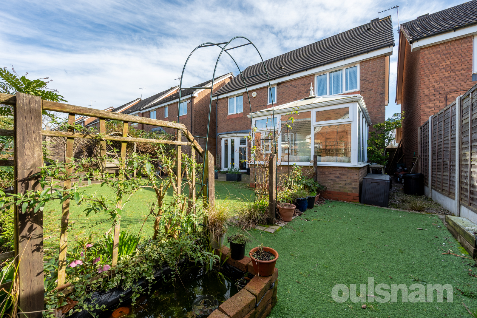 * Rear garden with shaped patio, raised flower beds flanked by sleepers, arbour, archway to further seating area and low maintenance artificial lawn, fencing borders