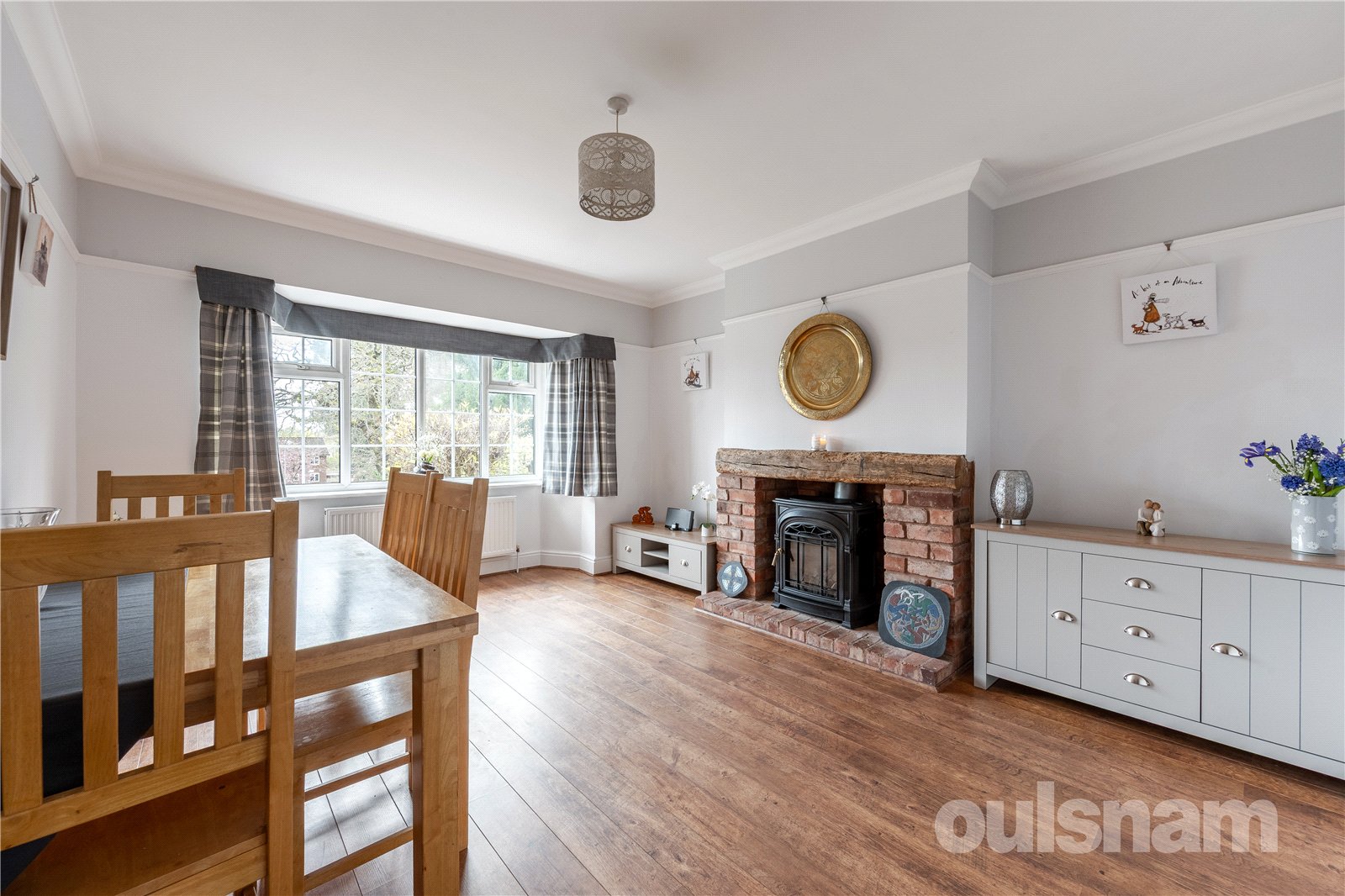 * Dining room with bay window and a feature gas fire, brick feature surround and wooden beam