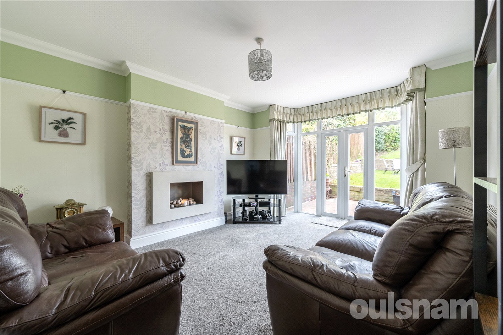 * Living room with gas fireplace and patio doors leading to the good-sized garden