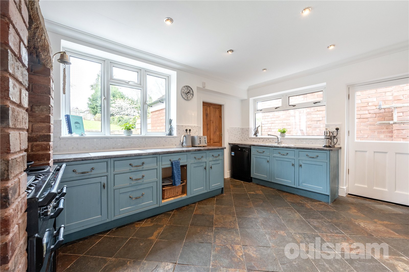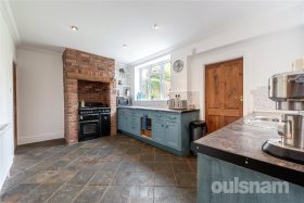 * Spacious kitchen comprising of a range of wall and base units and range cooker within brick recess plumbing for a dishwasher, pantry.