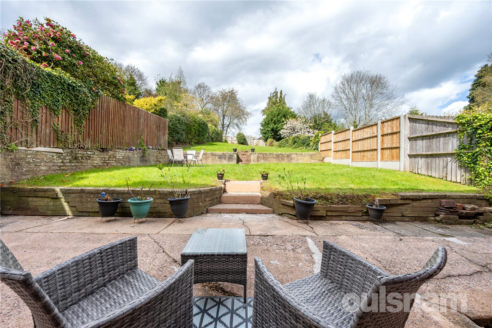 * Generous private tiered rear garden, with a patio seating area, and steps leading to the lawn, borders are a combination of fencing and hedgerows.