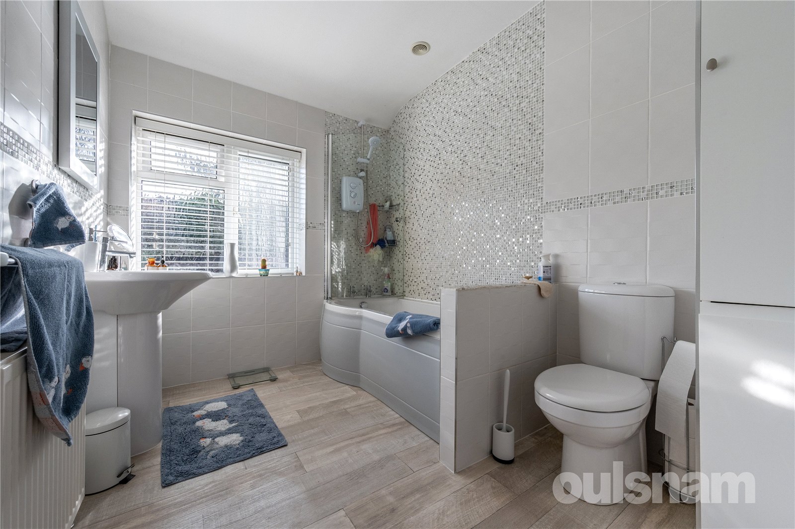The bathroom is fully tiled floor to ceiling and comprises a P-shaped bath with shower over, sink, dual-flush WC and a window to the rear aspect.