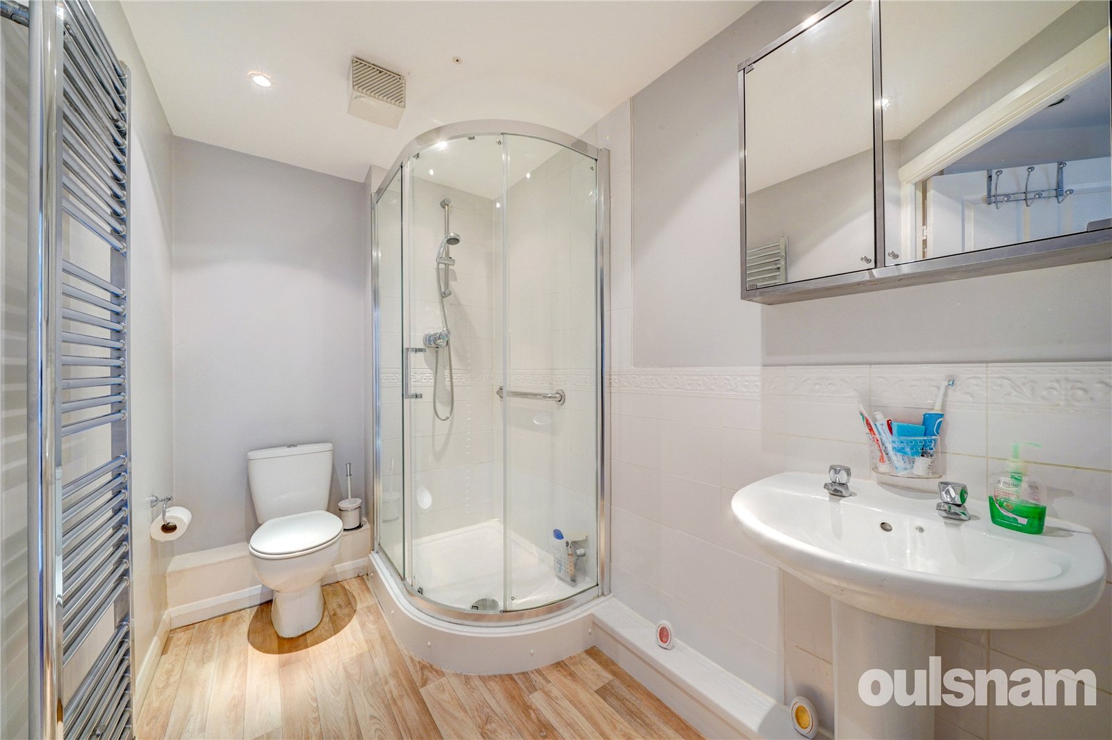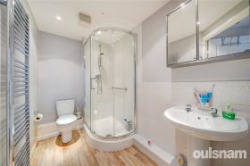 Fitted shower-room with a modern white suite comprising pedestal wash hand basin with mixer tap, low level dual flush WC and corner shower cubicle. There is a ladder style central heating radiator/towel rail.