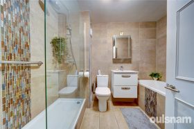 * Bathroom with shower cubicle and separate bath, wc and wash hand basin in a vanity unit.