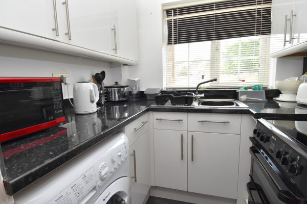 Fitted with a range of wall, drawer and base units with roll top work surfaces over, incorporating a stainless steel sink drainer, tiling to splash back areas, wall mounted central heating boiler, central heating radiator, space for electric oven, space for fridge freezer, space for washing machine, wood effect laminate flooring and UPVC double glazed window to the front elevation.