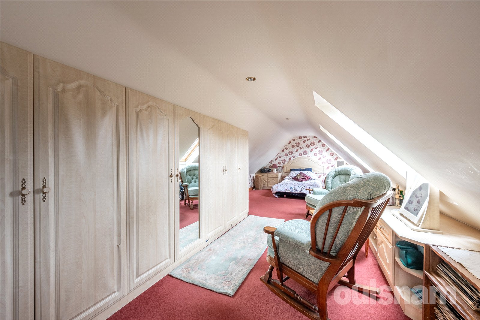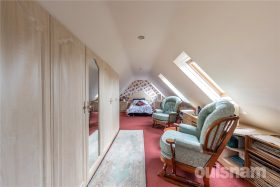 Stairs rise to the first-floor bedroom, a generously proportioned space benefiting from Velux windows, fitted wardrobes, and matching drawer units.