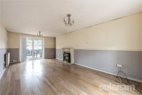 An spacious dining lounge with a feature electric fire (agent not tested), sliding patio doors to the front, and French doors opening onto the rear garden.