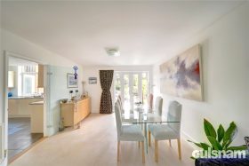 Approached via a welcoming open plan reception hall which lead through to the impressive dual aspect living room and split level dining room with patio doors onto the south facing rear gardens.