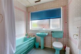 * Family bathroom is fitted with a coloured suite comprising panel bath with electric shower over, low level wc and wash hand basin and a door into useful storage cupboard with shelving