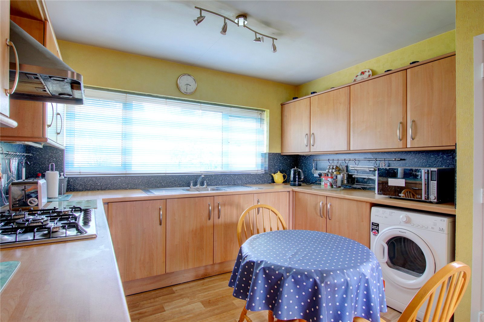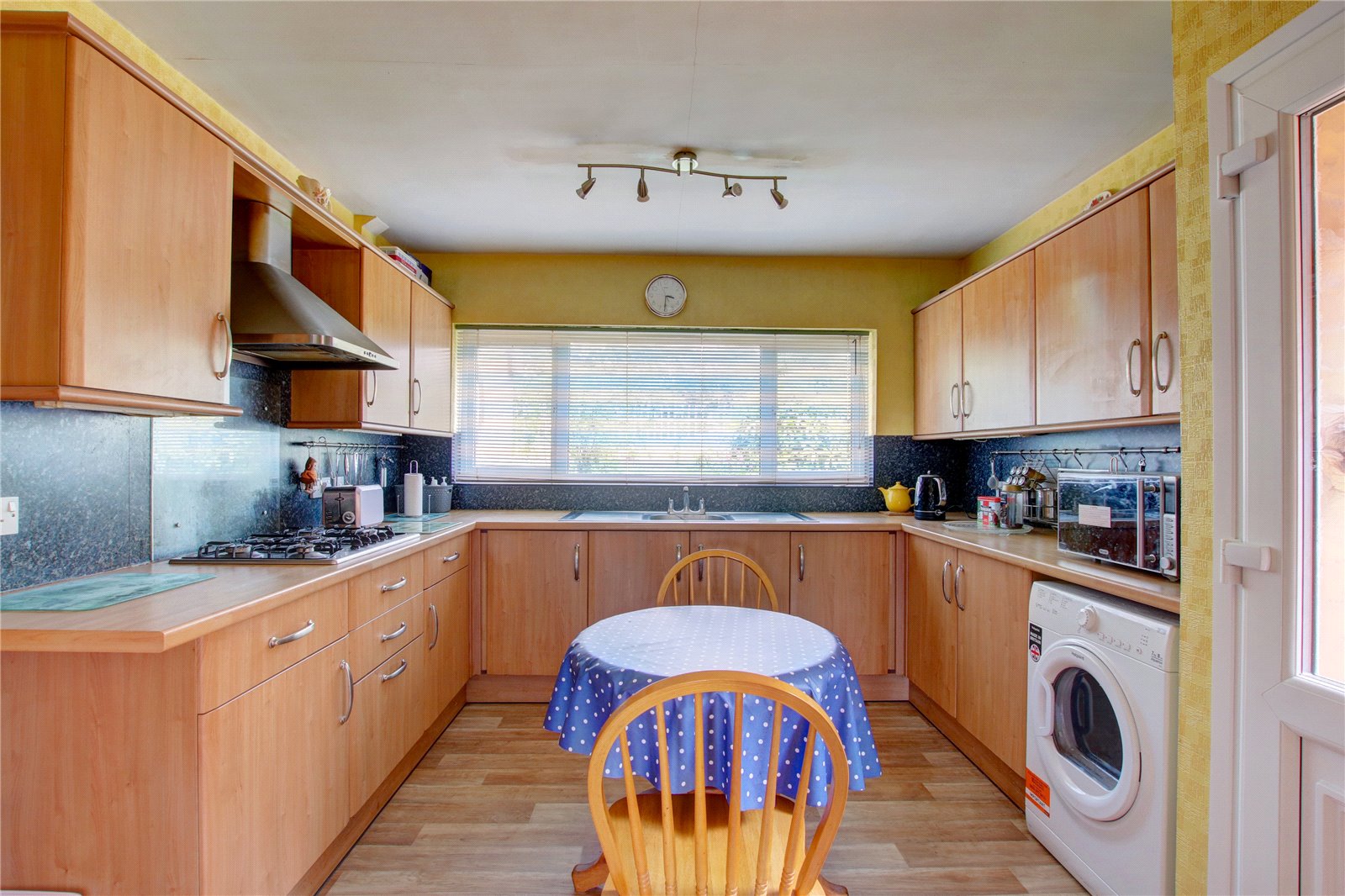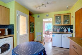 * Kitchen diner is fitted with a range of wall mounted and base units, comprising integral appliances to include oven and five ring gas hob, with extractor above, space for fridge and freezer, door into the dining room and pedestrian door provides access onto the side pathway.