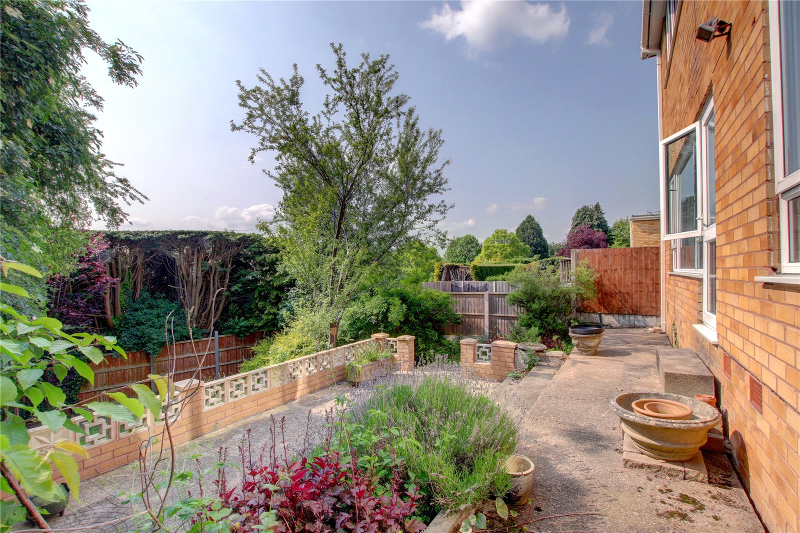 * The landscaped rear garden faces a South westerly aspect and features an initial paved patio area which extends across the rear of the property and pathways round to both side access gates, steps lead down to the remainder of the garden which is laid to lawn and bordered by flowers, trees and shrubs, there are gravelled landscaped pathways to the bottom enclosed by wooden panel fencing.