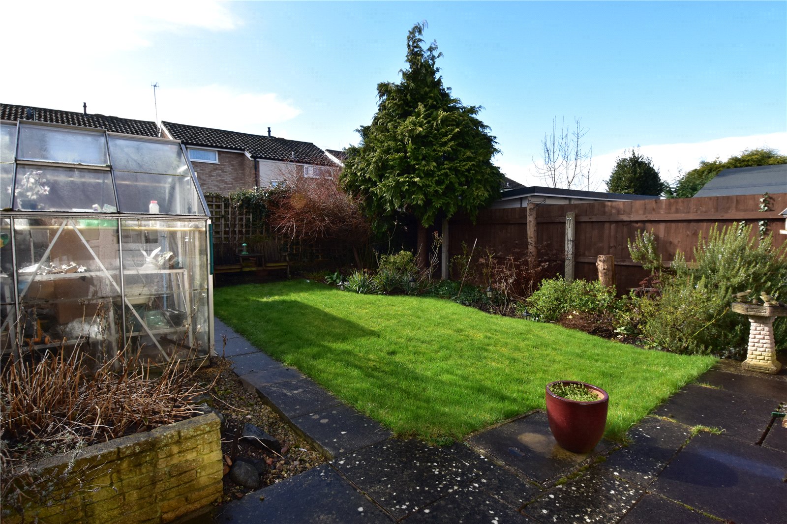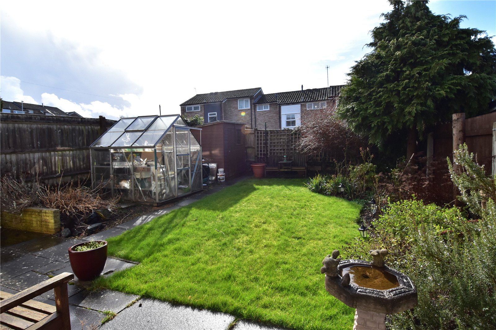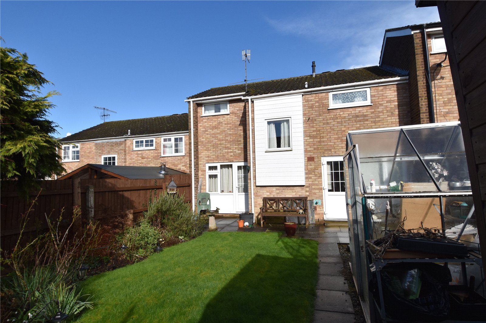 * Landscaped rear garden can be accessed from the kitchen diner and the door from the living room. The garden has a paved patio area with pathway having lawned areas to each side, greenhouse and shed, enclosed by wooden panel fencing