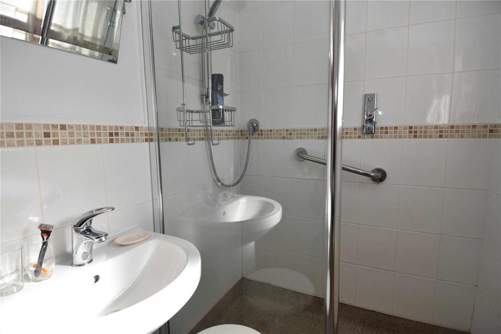 * Modern family shower room comprises a walk in shower, wash hand basin set into underneath storage unit and low level WC