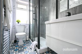 * First floor shower room with shower cubicle, WC, vanity unit and wall mounted heated towel rail