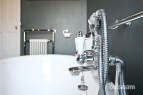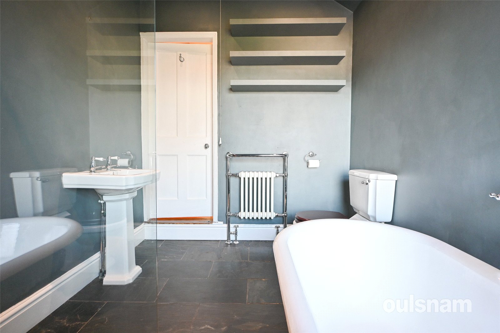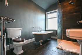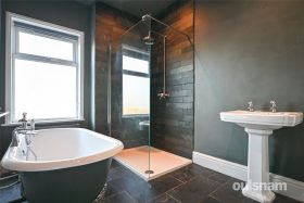 * Modern style first floor bathroom with a free standing roll top bath and a large separate walk in shower