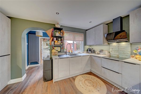 The kitchen is fitted with a range of contemporary base and wall mounted cupboards with gloss effect finish, integral gas oven and extractor fan. There is space for additional appliances and the window overlooks the well-presented garden. The Worcester Boiler is also located in the corner of the kitchen.