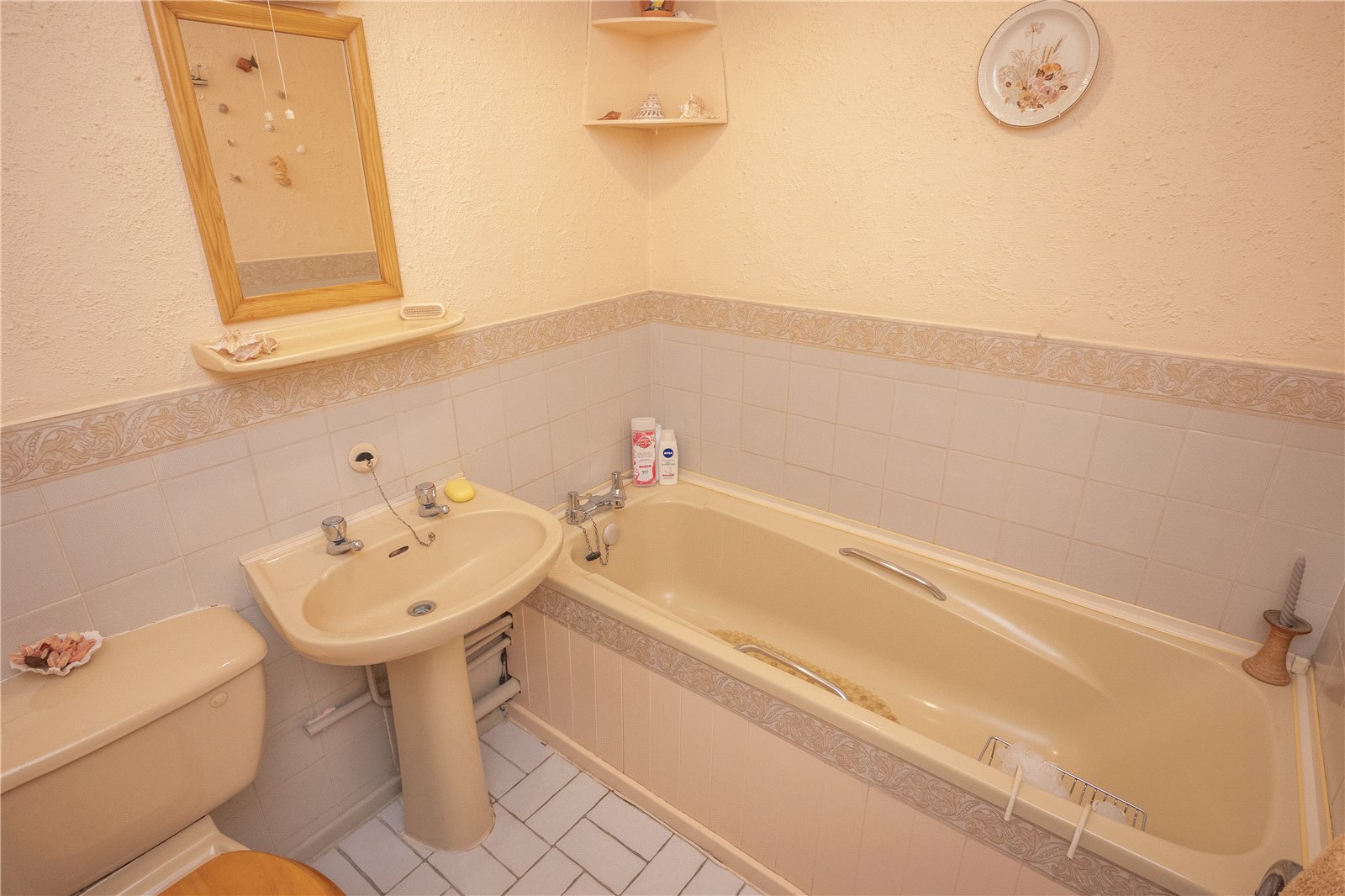 The bathroom has a coloured suite with tiled splash backs, tiled floor and heated towel rail.
