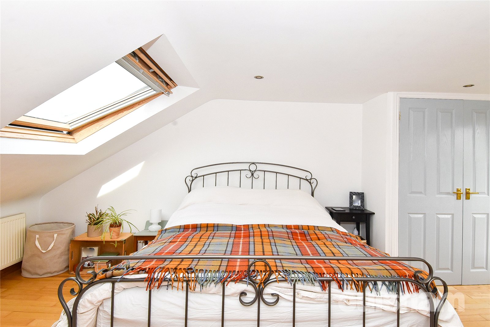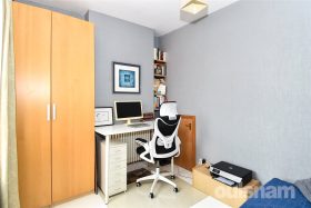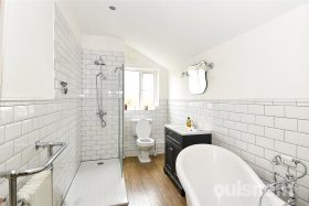 * The second floor bedroom is a bright and airy space, featuring a Velux window and two built-in storage cupboards. It benefits from an en-suite comprising a W.C., corner freestanding wash hand basin, and a shower cubicle. Please note that this room does have some restricted head height.