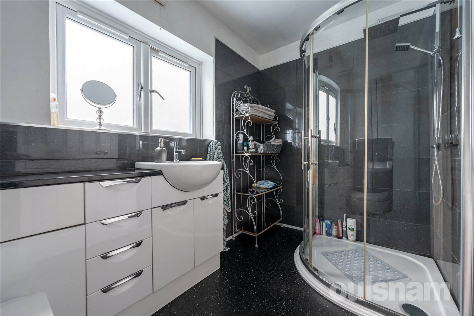 * En Suite shower room to bedroom one comprising: shower cubicle with rain shower head, wash hand basin on vanity unit with storage below, low level W/C and additional storage unit