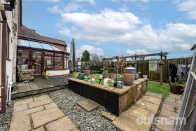* Rear garden with tiered decking area, outside tap, lawned area with raised flower beds and Pergola