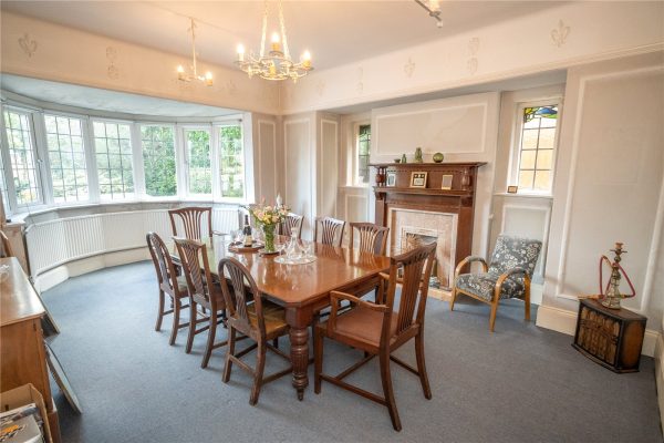 * A formal dining room with shakerstyle panelling, feature beams and a gas fire.