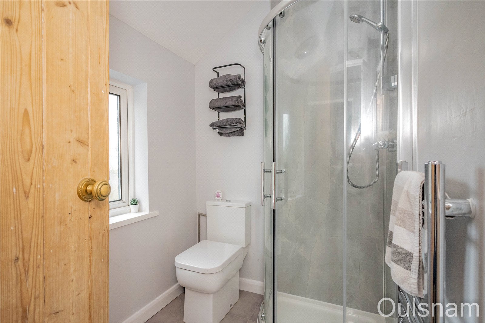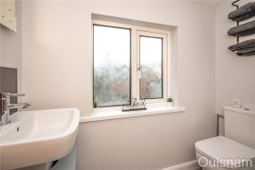 * Jack & Jill en-suite shower room with a fitted white suite comprising of wash hand basin, corner shower, toilet, heated towel rail and a window looking out to the rear.