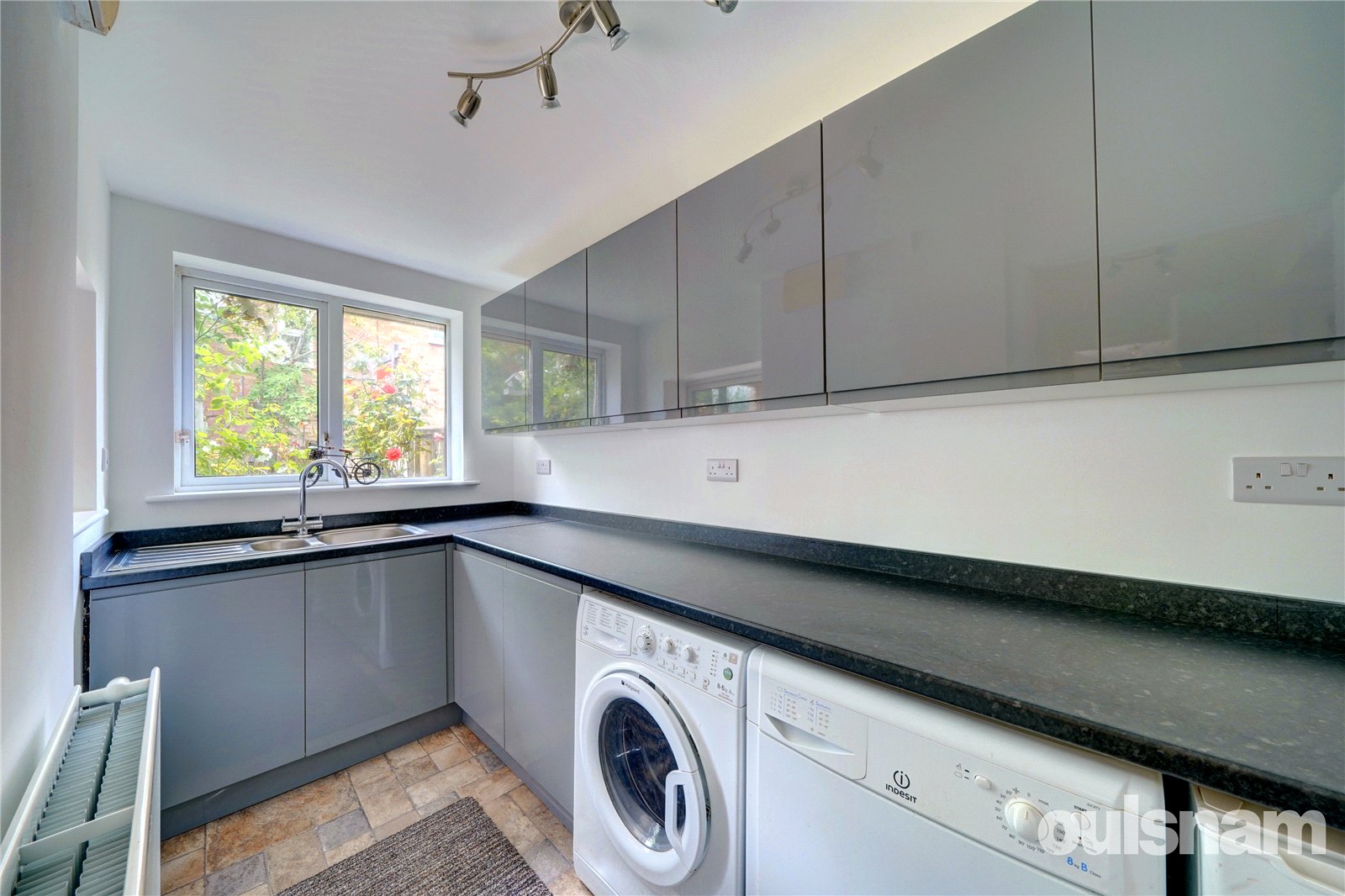 * The useful utility room has modern high gloss effect fronted wall and base units incorporating a stainless steel sink and drainer unit and has space and plumbing for a washing machine and tumble dryer
