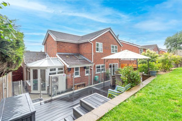The landscaped rear garden can be accessed directly from the dining area via sliding patio doors. It features an initial patio area leading onto a neatly kept lawn and a further patio, perfect for garden furniture. To the rear, a decking area offers an additional seating spot, while a pedestrian gate provides access to the garage.
