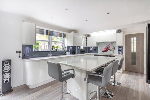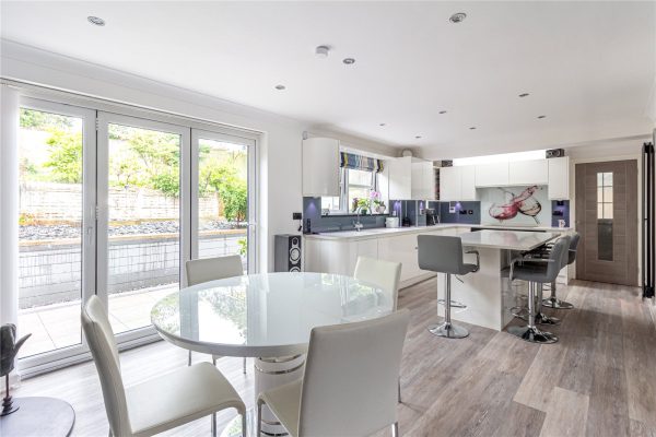 At the heart of the home is a stunning open-plan kitchen, dining, and family room. The kitchen is fitted with sleek shaker-style cabinetry, modern worktops, integrated appliances, and space for a range cooker. A central breakfast island with pendant lighting provides a natural hub for family life and informal dining. The adjoining dining space is perfectly placed for both everyday meals and entertaining, while the impressive family room is flooded with natural light from skylights and full-width sliding patio doors that open directly onto the rear garden. With vaulted ceilings, wood-effect flooring, and stylish décor, this is a truly inviting space for both relaxing and hosting.